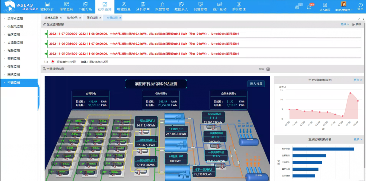 襄陽市科技館新館總建筑面積35268㎡,其中地上建筑面積26468㎡,地下建筑面積8800㎡,展教面積約20000㎡,屬國家特大型科技場館。為響應(yīng)國家和省節(jié)能主管部門有關(guān)公共建筑機構(gòu)節(jié)能管理的精神,提高襄陽科技館能源管理信息化水平,經(jīng)公開招標,引進萬洲電氣WBEAS建筑智能優(yōu)化節(jié)能系統(tǒng),該項目于2022年3月初開始建設(shè),5月底完成系統(tǒng)上線運行和驗收。
