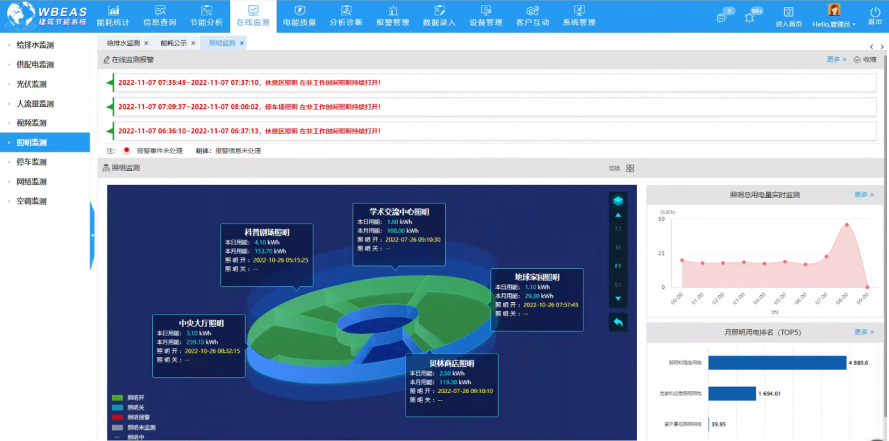 實現(xiàn)重點區(qū)域照明日能耗和月能耗信息展示以及重點區(qū)域照明開關(guān)狀態(tài)和視頻監(jiān)測以及異常開關(guān)報警。