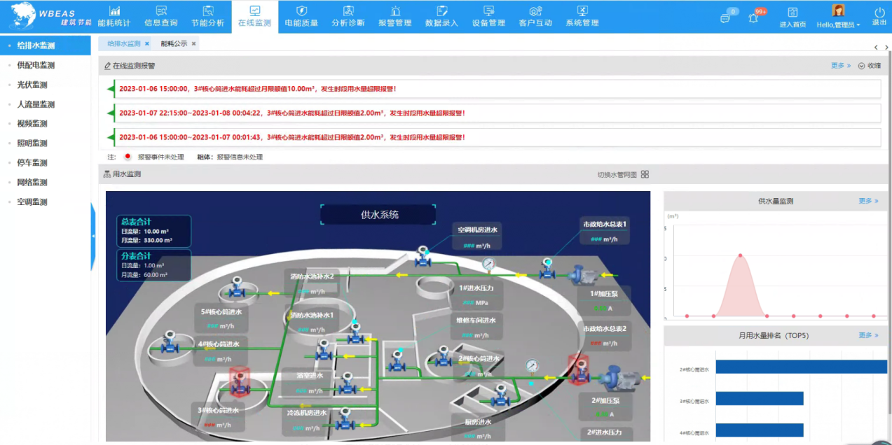 實現(xiàn)給排水管網(wǎng)圖3D展示,給排水設(shè)備運行狀態(tài)(電流、功率)展示,設(shè)備檔案(設(shè)備型號、額定電流、額定功率)展示和各個排水區(qū)域水位、供水水壓信息展示;水泵房內(nèi)人員行為(人員異常進入,違規(guī)操作設(shè)備)異常報警。
