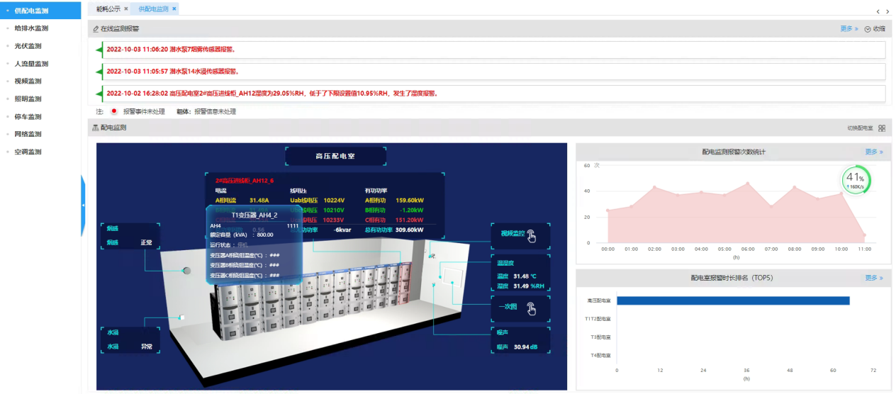 實現(xiàn)配電室內(nèi)部環(huán)境信息(煙感、溫濕度、噪聲、水浸)以及配電柜內(nèi)各個回路運行狀態(tài)監(jiān)測和異常報警信息統(tǒng)計。