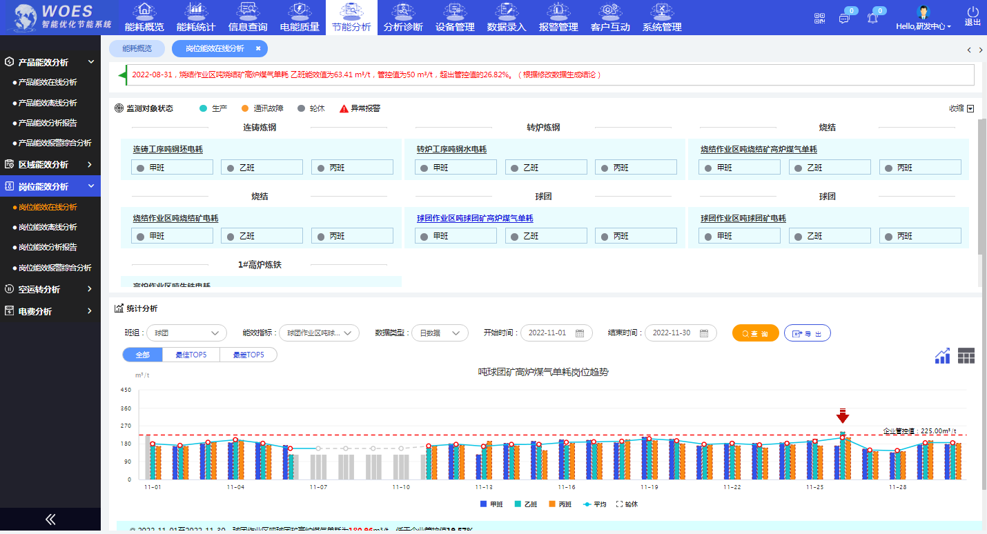 4、班組能效管控考核,提高生產效率、能源使用效率。通過實時查看每月每日每個班組的產量、能耗和單耗情況,系統自動開展能效診斷分析,發現各生產班組的能耗差異。針對各生產工序(石灰窯、燒結、球團、噴煤、高爐、熱風爐、轉爐、連鑄、加熱爐、軋鋼)規分別建立班組能效評價考核體系,范員工操作,提高員工節能意識,實現年節約收益120萬元。