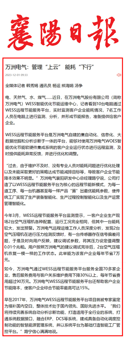 “過去,由于維護不及時、沒有專業(yè)人員對能耗問題進行優(yōu)化處理以及未能采取更好的策略達成節(jié)能減排目標等,導致客戶企業(yè)節(jié)能降本效果不明顯。”萬洲電氣襄陽研發(fā)中心總經理路寧說,公司打造了以WESS遠程節(jié)能服務平臺為核心的遠程節(jié)能新模式,為每一道工序、每一臺機器甚至每一樣產品“算”出最優(yōu)能耗參數(shù),使傳統(tǒng)工廠實現(xiàn)了生產裝備智能化、生產過程控制智能化以及生產運營管理智能化。