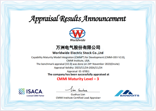 近日,萬(wàn)洲電氣取得CMMI研究院頒發(fā)的CMMI3級(jí)認(rèn)證證書(shū),標(biāo)志著萬(wàn)洲電氣的軟件研發(fā)能力成熟度已達(dá)到國(guó)際水準(zhǔn)。