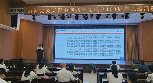 隨后,李書(shū)記為大家?guī)?lái)了一堂教育深刻的主題黨課,李書(shū)記首先介紹了黨紀(jì)學(xué)習(xí)教育的活動(dòng)背景及計(jì)劃安排,詳細(xì)解讀了《中國(guó)共產(chǎn)黨紀(jì)律處分條例》中的政治紀(jì)律、組織紀(jì)律、廉潔紀(jì)律、群眾紀(jì)律、工作紀(jì)律和生活紀(jì)律等內(nèi)容,并結(jié)合公司管理制度,講解了《萬(wàn)洲電氣加強(qiáng)反腐敗工作的通知》、“萬(wàn)洲電氣廉潔自律準(zhǔn)則”、“四慎原則”、“四治三整”、“四向心態(tài)”等內(nèi)容要求。