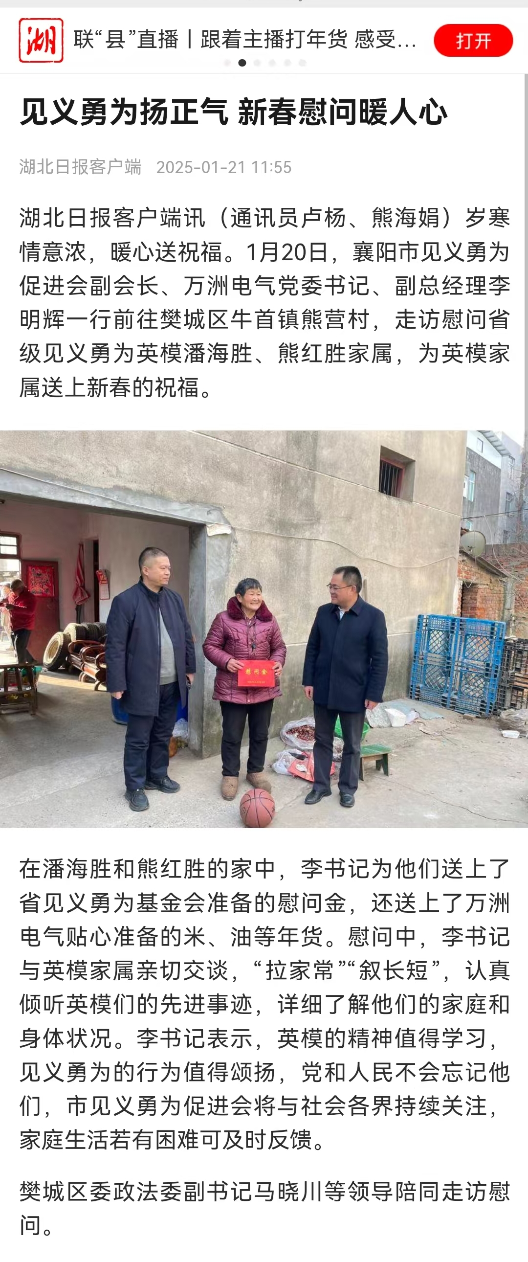 湖北日報客戶端訊(通訊員盧楊、熊海娟)歲寒情意濃,暖心送祝福。1月20日,襄陽市見義勇為促進(jìn)會副會長、萬洲電氣黨委書記、副總經(jīng)理李明輝一行前往樊城區(qū)牛首鎮(zhèn)熊營村,走訪慰問省級見義勇為英模潘海勝、熊紅勝家屬,為英模家屬送上新春的祝福。