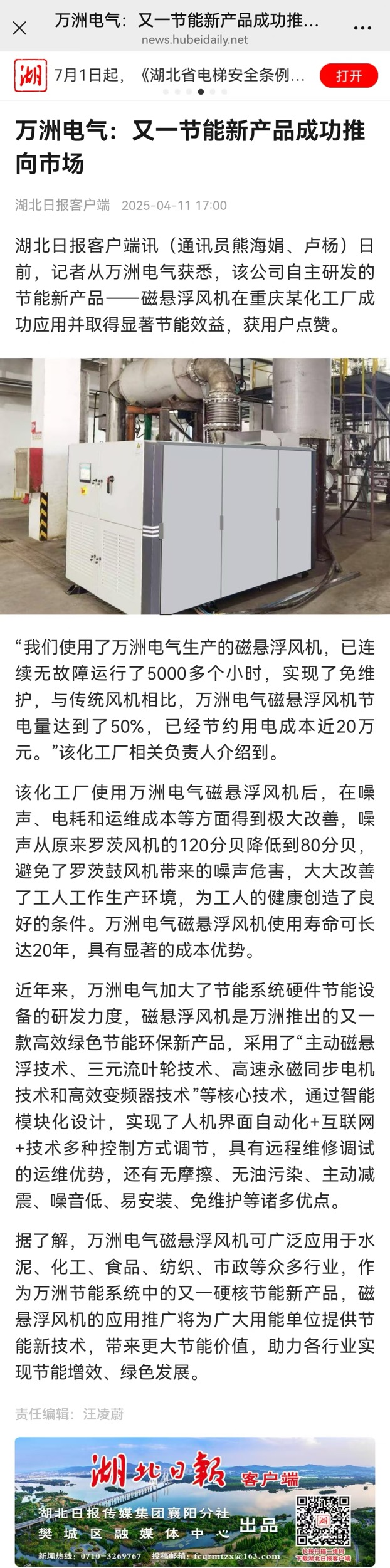 據了解,萬洲電氣磁懸浮風機可廣泛應用于水泥、化工、食品、紡織、市政等眾多行業,作為萬洲節能系統中的又一硬核節能新產品,磁懸浮風機的應用推廣將為廣大用能單位提供節能新技術,帶來更大節能價值,助力各行業實現節能增效、綠色發展。