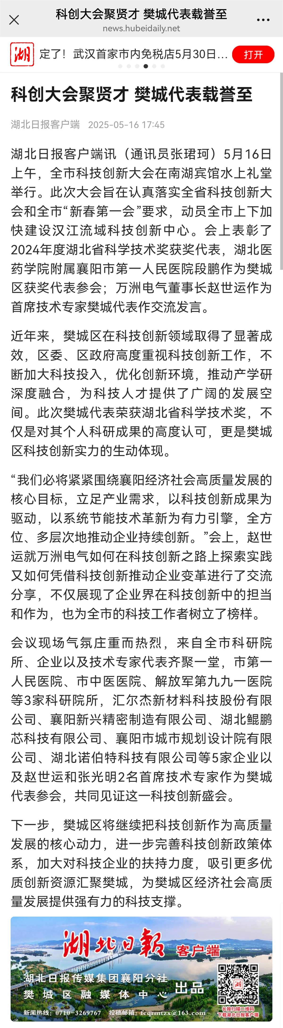 5月16日上午,全市科技創新大會在南湖賓館水上禮堂舉行。此次大會旨在認真落實全省科技創新大會和全市“新春第一會”要求,動員全市上下加快建設漢江流域科技創新中心。會上表彰了2024年度湖北省科學技術獎獲獎代表,湖北醫藥學院附屬襄陽市第一人民醫院段鵬作為樊城區獲獎代表參會;萬洲電氣董事長趙世運作為首席技術專家樊城代表作交流發言。