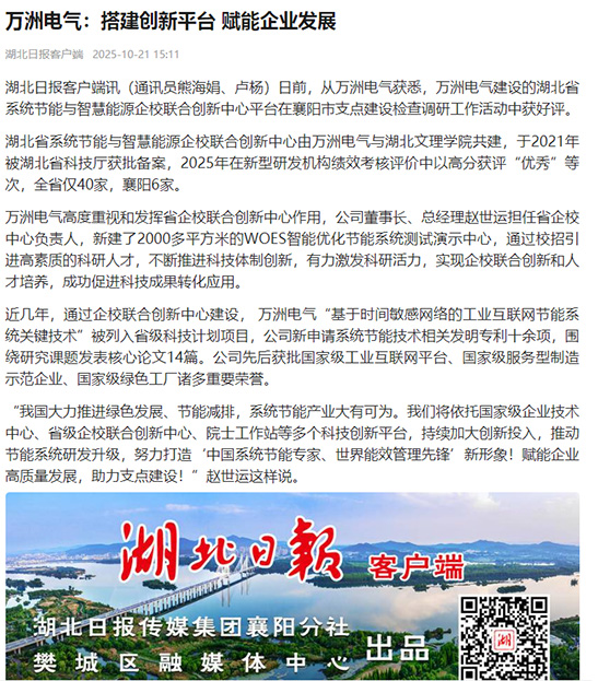 湖北省系統節能與智慧能源企校聯合創新中心由萬洲電氣與湖北文理學院共建,于2021年被湖北省科技廳獲批備案,2025年在新型研發機構績效考核評價中以高分獲評“優秀”等次,全省僅40家,襄陽6家。