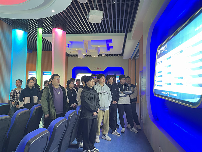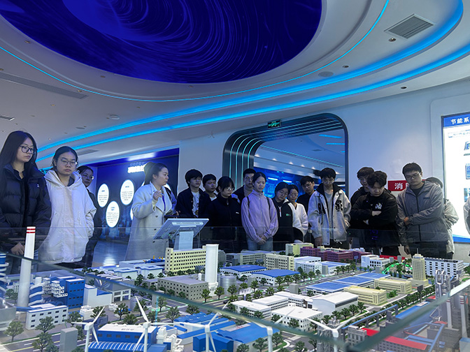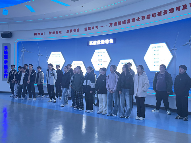 實習第一天,同學們首先參觀了公司廠區,在一樓文化展示廳,創立之初的使命擔當、以人為本的企業文化、碩果累累的國牌榮譽深耕節能行業標桿,通過參觀讓同學們對萬洲有了全方位認知。WOES節能系統演示廳,萬洲重大科技創新產品——智能優化節能系統的研發歷程、優勢特色、應用領域及未來發展吸引了同學們駐足觀看,并饒有興趣地現場體驗操作系統。