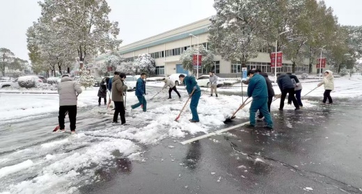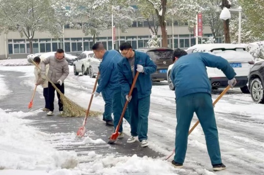寒風中,大家分工明確、配合默契,有的揮鍬破冰、有的揮帚掃雪、有的合力清運,忙碌的身影在皚皚白雪中格外耀眼。撞擊冰層的“砰砰”聲、清掃積雪的“簌簌”聲,交織成冬日里最暖心的旋律。盡管雙手被寒風凍得通紅,臉頰被寒風吹得發麻,但沒有人叫苦叫累,以飽滿的熱情展示萬洲黨員風采。經過近兩個小時的奮戰,園區內各主要路段的積雪被清除,一條干凈通暢的“安全路”“暖心路”赫然呈現,為全體萬洲人的出行筑牢了安全屏障。