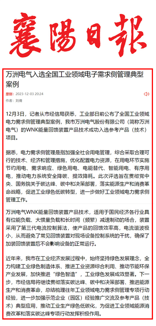 【襄陽日報】萬洲電氣入選全國工業領域電子需求側管理...