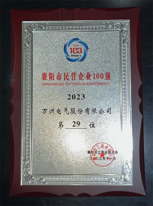 11月1日上午,第十屆(2023)襄陽市民營企業百強發布會在民發瑞際酒店舉行,萬洲電氣股份有限公司再次以行業第一榮登襄陽市民營企業100強榜單,位列全市民營企業第29位,萬洲電氣董事長、總經理趙世運還被授予“襄陽市優秀企業家”榮譽稱號。
