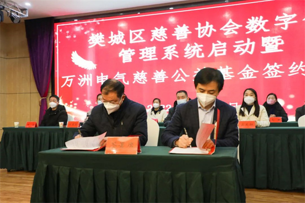12月30日下午,在樊城區慈善協會舉辦的“ 樊城區慈善協會數字化管理系統啟動暨萬洲電氣慈善公益基金簽約”儀式上,萬洲電氣為樊城區慈善協會捐款13萬元成立“萬洲電氣公益基金”并獲“慈善愛心單位”榮譽稱號。萬洲電氣董事長、總經理趙世運參加簽約儀式。