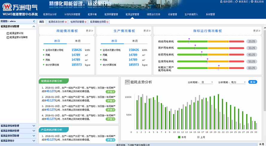 WEMS能源管理中心系統(tǒng)為萬(wàn)洲系統(tǒng)節(jié)能系列產(chǎn)品之一,通過(guò)對(duì)生產(chǎn)過(guò)程全能源消耗的數(shù)據(jù)進(jìn)行采集、加工、分析、處理以實(shí)現(xiàn)對(duì)能源計(jì)劃、能源實(shí)績(jī)、能源預(yù)測(cè)、能源質(zhì)量與物料供應(yīng)、能源平衡與生產(chǎn)調(diào)度等全方位的監(jiān)管和綜合分析。實(shí)現(xiàn)統(tǒng)一生產(chǎn)調(diào)度、統(tǒng)一能源配給,達(dá)到能源精細(xì)化管控、優(yōu)化生產(chǎn)優(yōu)化能耗的目的,真正起到提高企業(yè)生產(chǎn)與能源管理水平、提高企業(yè)能源利用效率,降低單位產(chǎn)品綜合能耗的作用。