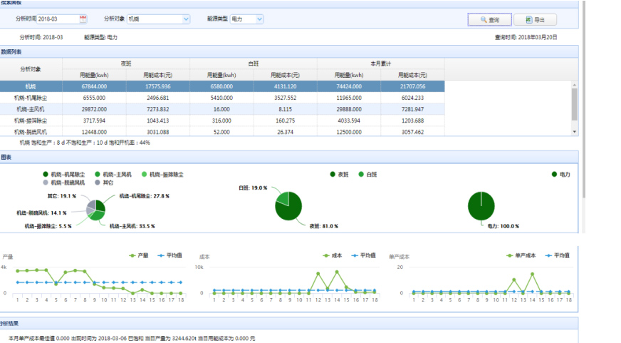 1、從班組、區(qū)域等多個(gè)維度分析各個(gè)生產(chǎn)節(jié)點(diǎn)的能源成本數(shù)據(jù),并圖形化展示分析結(jié)果。