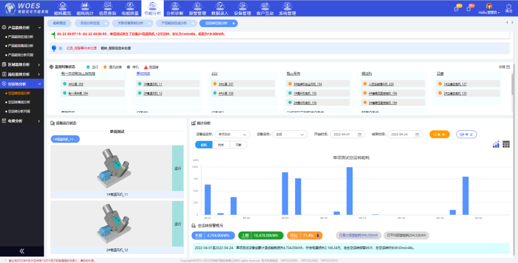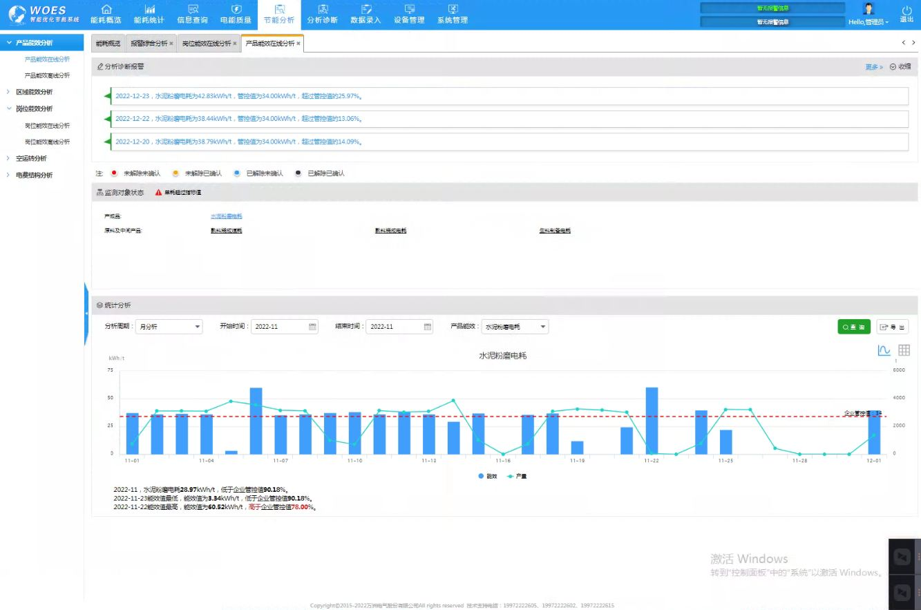 節(jié)能分析從產(chǎn)品能效分析、崗位能效分析、區(qū)域能耗分析、空運(yùn)轉(zhuǎn)分析以及電費(fèi)結(jié)構(gòu)分析實(shí)現(xiàn)多角度全方位的在線分析,并提供相關(guān)的分析診斷策略和結(jié)論,為管理者調(diào)整用能提供依據(jù)。