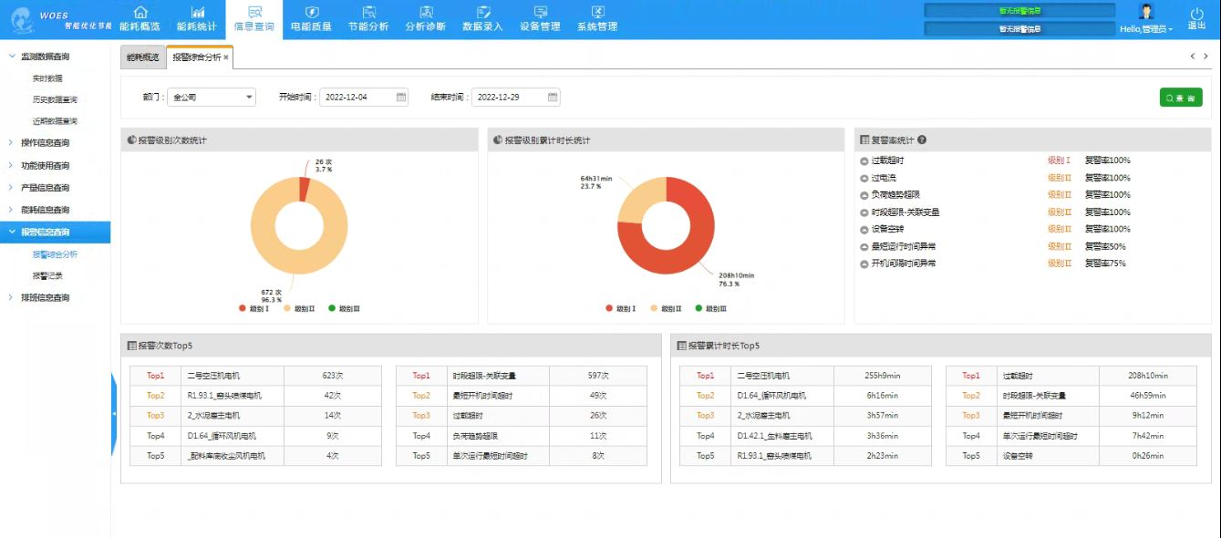 主要是對(duì)設(shè)置的報(bào)警信息進(jìn)行集中管理,并針對(duì)報(bào)警信息進(jìn)行匯總統(tǒng)計(jì)分析,分析經(jīng)常出現(xiàn)問題的故障點(diǎn)、故障次數(shù)等,自動(dòng)生成設(shè)備異常管理綜合報(bào)告。使用報(bào)警功能可以對(duì)重要的用能設(shè)備(空壓機(jī)、循環(huán)風(fēng)機(jī)、水泥磨主電機(jī)等)設(shè)置用能參數(shù)預(yù)警,以幫助用能管理者更好的管理和維護(hù)重點(diǎn)用能設(shè)備,一方面控制主要用能設(shè)備的能耗,另一方面關(guān)注關(guān)鍵生產(chǎn)設(shè)備的運(yùn)行狀態(tài),避免設(shè)備故障造成生產(chǎn)的影響。