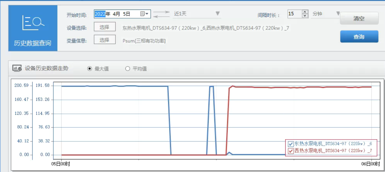 2、熱水泵運行狀態優化節能。現場兩臺熱水泵,額定功率均為220kW,采用一用一備方式運行。用戶通過系統實時數據功能發現:綜合泵房東熱水泵和西熱水泵運行存在差異,東熱水泵運行負荷穩定在190kW,西熱水泵運行負荷穩定在200kW。發現問題后對西熱水泵進行了檢修,檢修完畢后西熱水泵功率降低了10kW,每年可以節約電費2.9萬元。
