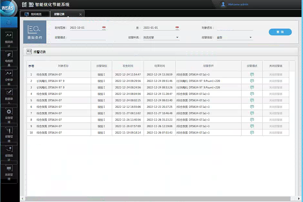 主要是對設置的報警信息進行集中管理,并針對報警信息進行匯總統計分析,分析經常出現問題的故障點、故障次數等,自動生成設備異常管理綜合報告。使用報警功能可以對重要的用能設備(引風機、綜合泵房等)設置用能參數預警,以幫助用能管理者更好的管理和維護重點用能設備,一方面控制主要用能設備的能耗,另一方面關注關鍵生產設備的運行狀態,避免設備故障造成生產的影響。